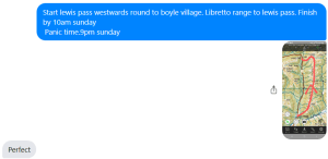 - Longer trips with uncertainty around your date due out – take the most pessimistic and add 1-2 days. This would depend on how much food you are carrying have and if you might get stuck behind a swollen river etc.