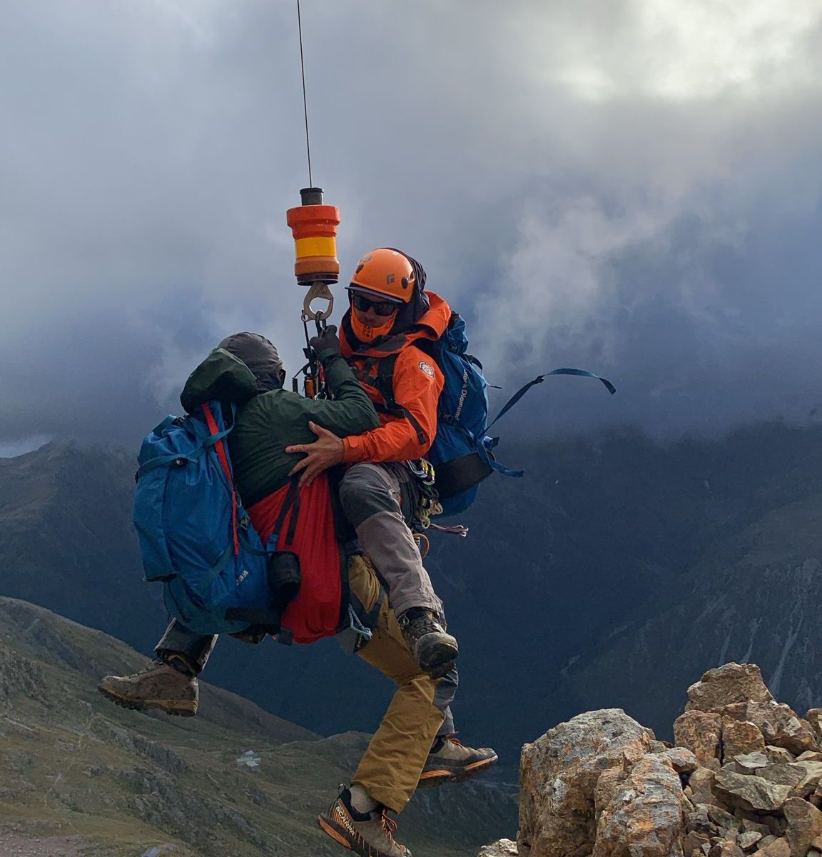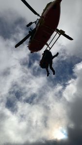 At 6.15pm both team members are winched down to the two climbers, where one is injured. They are anchored to rock face and in a relatively secure location, on a ledge and accessible to the heli winch. Heli comes in very close to rock face, and this is a challenge with strengthening winds.