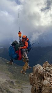While the heli returns to the staging area, the team secure themselves, then lower the injured climber to a ledge approx. 15 metres below where they were found. The team and climber are secured there, and radio the heli crew to return for extraction.